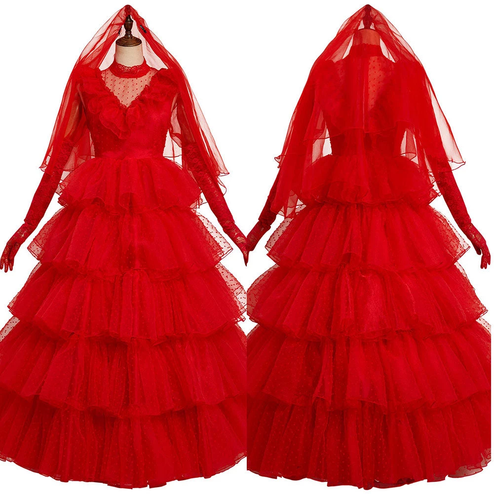 Movie Beetle Juice Lydia Cosplay Costume Red Wedding Dress Outfits Halloween Carnival Suit